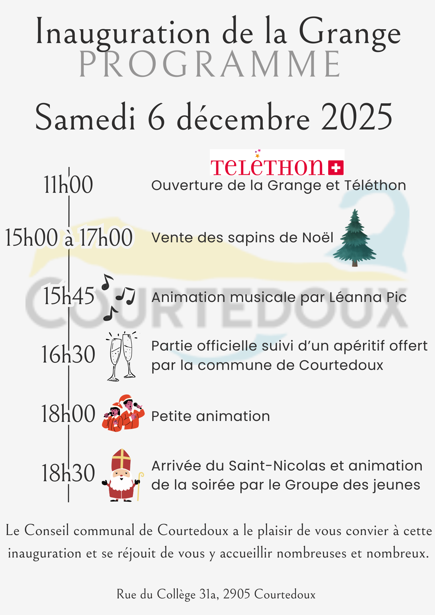 Inauguration de la Grange Accueil » Vivre à Courtedoux » Événements » Inauguration de la... Présentation Publié le 21 novembre 2025 Pagination bas « Voir : Noël sous les serres Contact Responsable Commune de Courtedoux Événement Le 06/12/2025 Rue du Collège 31A 2905 Courtedoux
