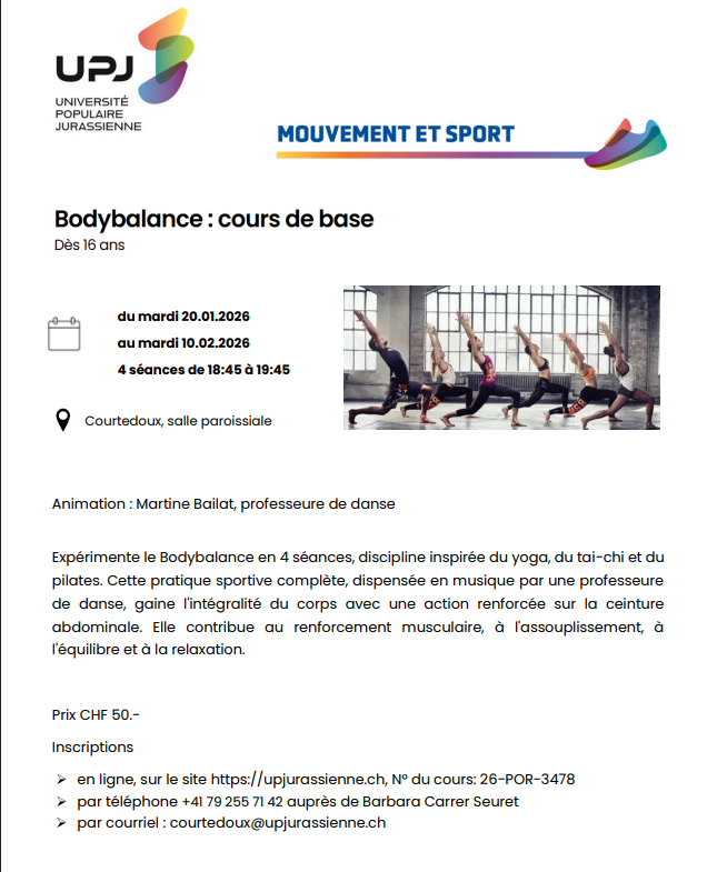 Animation par Mme Martine Bailat, professeure de danse. Expérimente le Bodybalance en 4 séances, discipline inspirée du yoga, du tai-chi et du pilates. Cette pratique sportive complète, dispensée en musique par une professeure de danse, gaine l'intégralité du corps avec une action renforcée sur la ceinture abdominale. Elle contribue au renforcement musculaire, à l'assouplissement, à l'équilibre et à la relaxation.